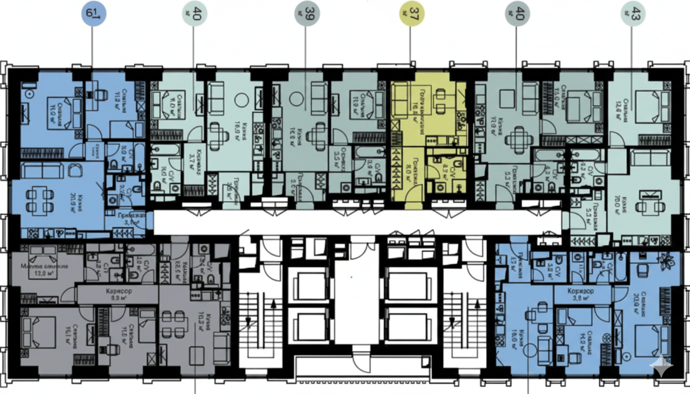После этого система автоматически применяет визуальные правила. Межквартирные стены заливаются черным цветом, межкомнатные — полупрозрачным, каждая квартира получает уникальный цвет исходя из количества комнат. Инженерные стояки остаются белыми с черной обводкой, чтобы не теряться на фоне.